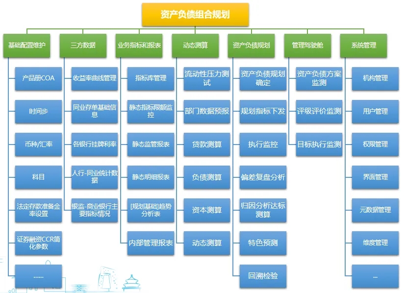 ● 资产负债多场景的动态规划和测算:在满足资本充足率、流动性风险、利率风险、资产质量、MPA考核等监管和内部管理指标、预期利润等多种管理指标条件下,实现对全行资产负债整体规模、结构、利润的各情景动态测算。